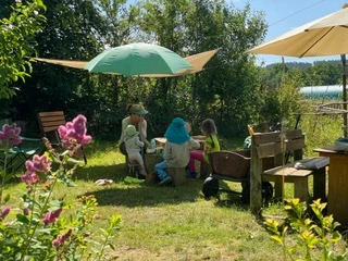 Auf unserem Grundstück mit einer Fläche von ca. 4.000 Quadratmetern befindet sich unser kleines Haus mit einem gemütlichen Gruppenraum für freie und angeleitete Beschäftigungen sowie einem abgegrenzten Gartenbereich für die Freispielzeit. Hier erleben die Kinder im Rahmen ausgedehnter, selbstbestimmter Aktivitäten unmittelbare Erfahrungen mit Pflanzen und Tieren.